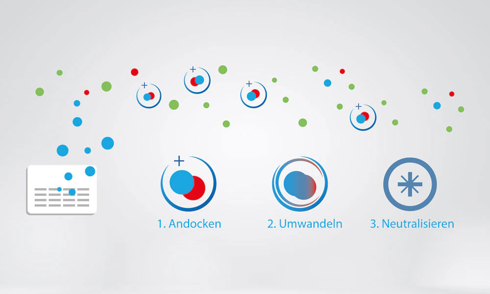 Die Airomex®-Formel nutzt eine natürliche Substanz auf Basis von Fruchtmaiszucker. Sie reagiert in der Luft mit organischen Geruchsstoffen und oxidiert sie – der Geruch wird abgebaut. Findet Airomex® nichts zum Reagieren, zerfällt es nach kurzer Zeit wieder restlos zu O₂ (Sauerstoff).