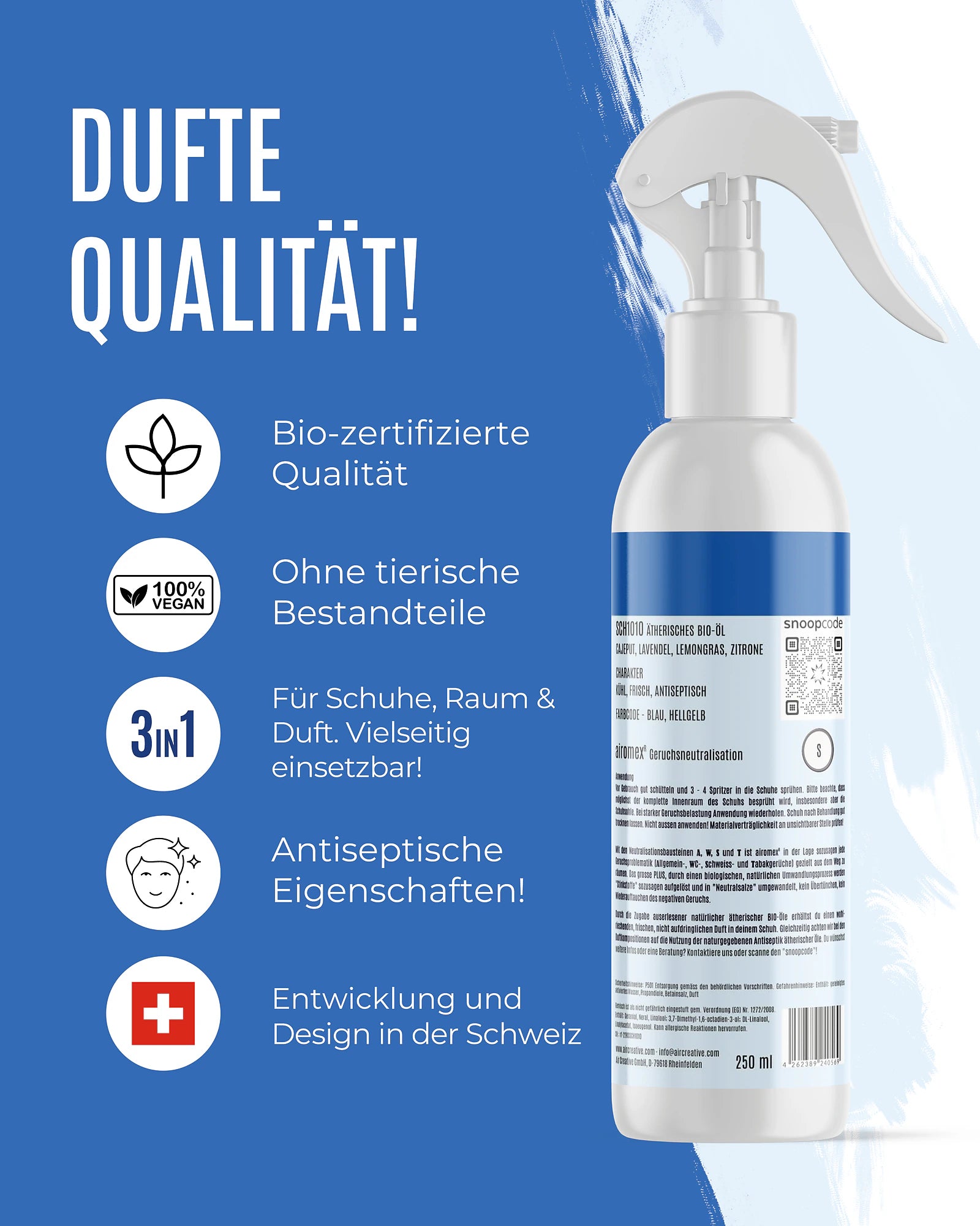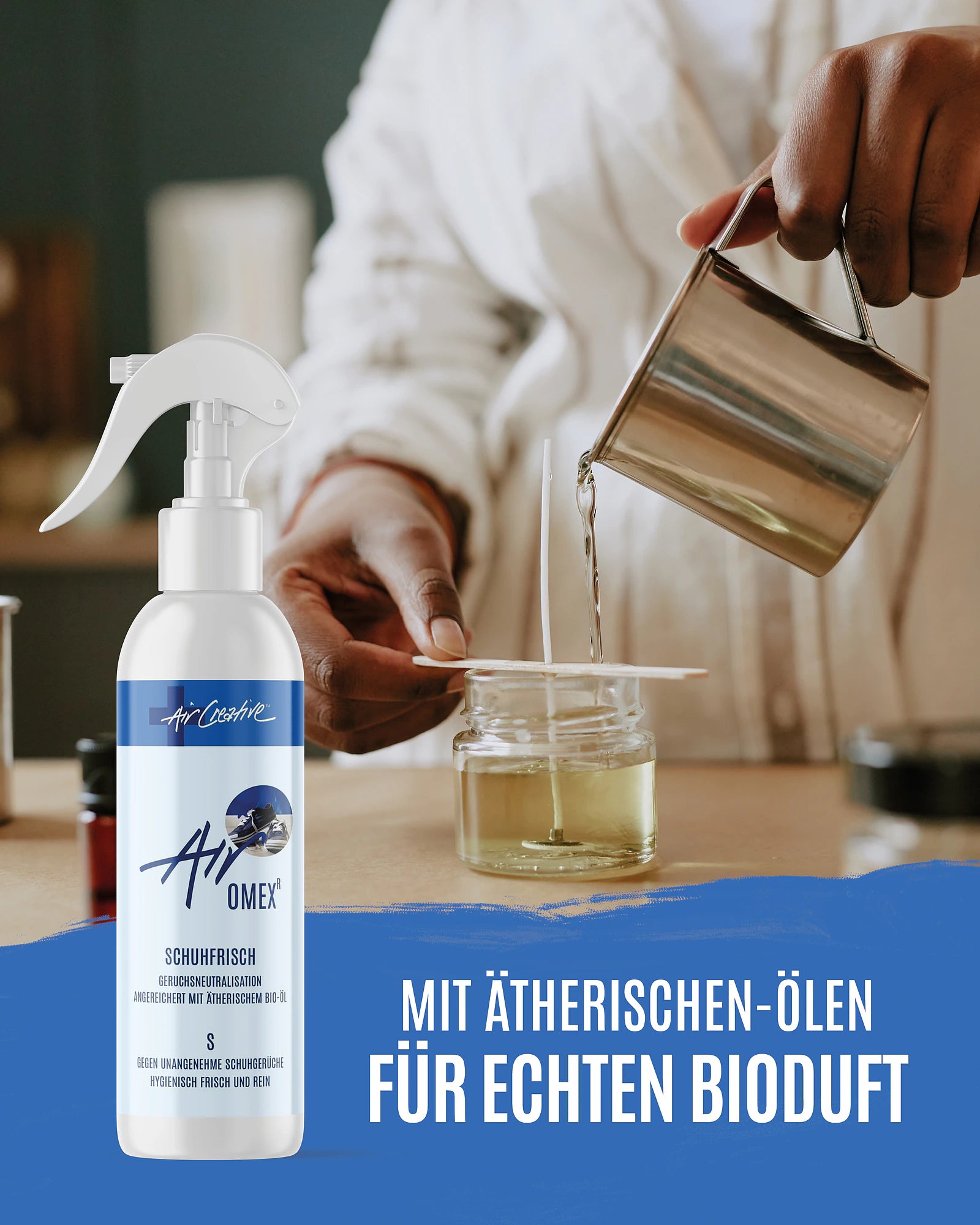 Verabschiede dich von unangenehmen Schuhgerüchen und begrüße eine neue Dimension der Frische und Hygiene – jederzeit und überall. Unser Geruchsneutralisierer Airomex® Schuhfrisch ist die innovative, natürliche Lösung, um unliebsame Gerüche nicht nur in der Luft, sondern auch direkt in deinen Schuhen effektiv zu neutralisieren. Anstelle von oberflächlichen Überdeckern setzen wir auf die kraftvolle Airomex®-Formel, ergänzt durch ausgewählte, naturreine BIO-Öle.
